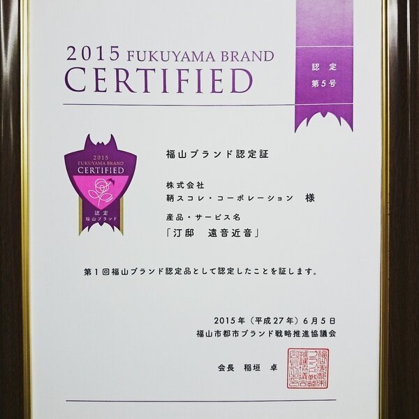 「福山ブランド」福山市の魅力を高める産品や、サービス、まちづくり活動を対象とし、それらを福山市のブランドと認定されるものです!!この度当館『汀邸 遠音近音』が選ばれました!!福山市を代表する魅力の1つとして発信し続けていけますよう、更に遠音近音ならではのおもてなし、サービスに努めて参ります‼