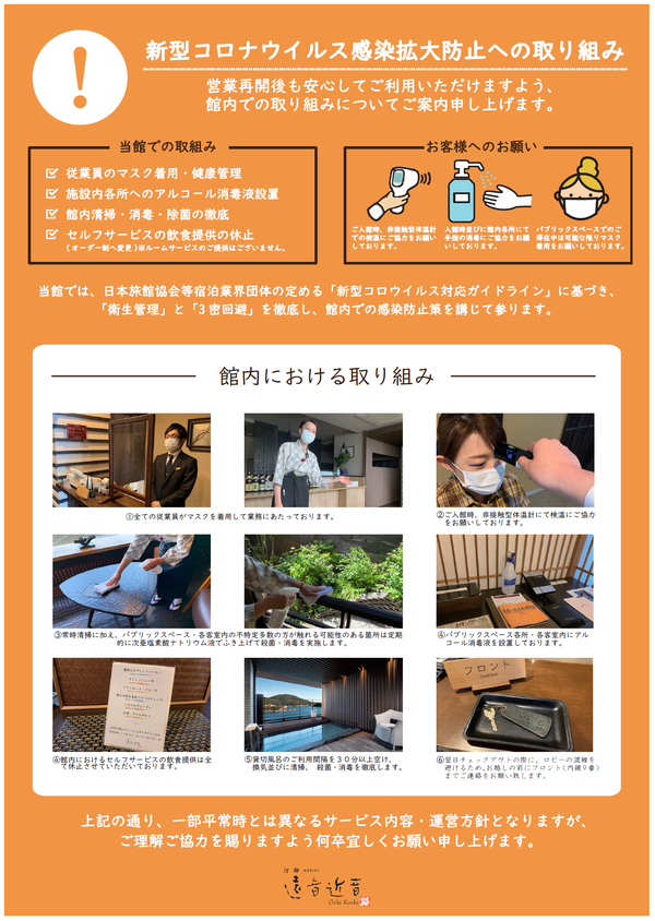 いつもご愛顧賜り誠にありがとうございます。営業再開にあたり当館が実施をしております対策をお知らせいたします。お客様と従業員の安心・安全を確保するため通常のおもてなしとは異なる部分もございますが、快適なお時間をお過ごし頂けますように精一杯努めて参りたいと存じます。ご理解ご協力を何卒宜しくお願い申し上げます。皆様のお越しをお待ち申し上げております。