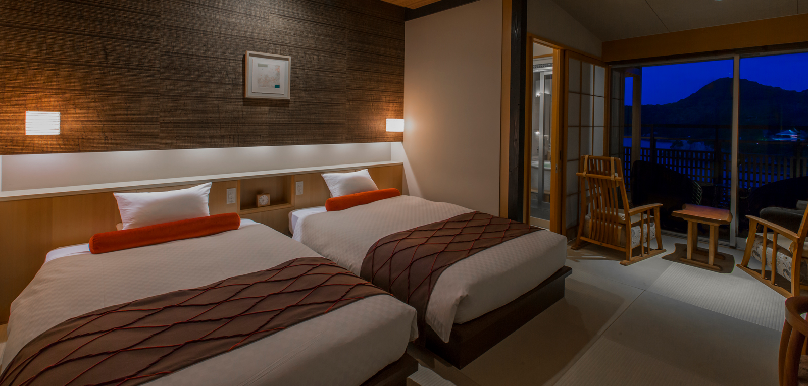 間口を広くとったワイドビューツインは53.6㎡。温泉露天風呂はもちろん、ウッドデッキやお部屋からも、景趣をお楽しみいただけます。